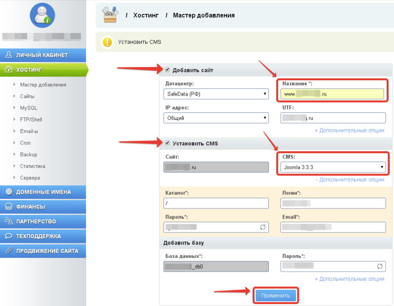 Если Вы добавляете сайт, то в поле Название - введите имя вашего домена. Если же нет, то в области Установить CMS в выпадающем списке Сайт - выберите для какого сайта вам необходима установка CMS. Далее, в выпадающем списке CMS: - выберите пункт Joomla.