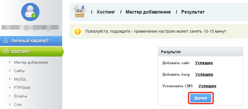 Теперь, в течение 10-15 минут, к вам на электронный ящик (предоставленный для регистрации) придет письмо с данными доступа к CMS Joomla. Нажмите кнопку Далее.