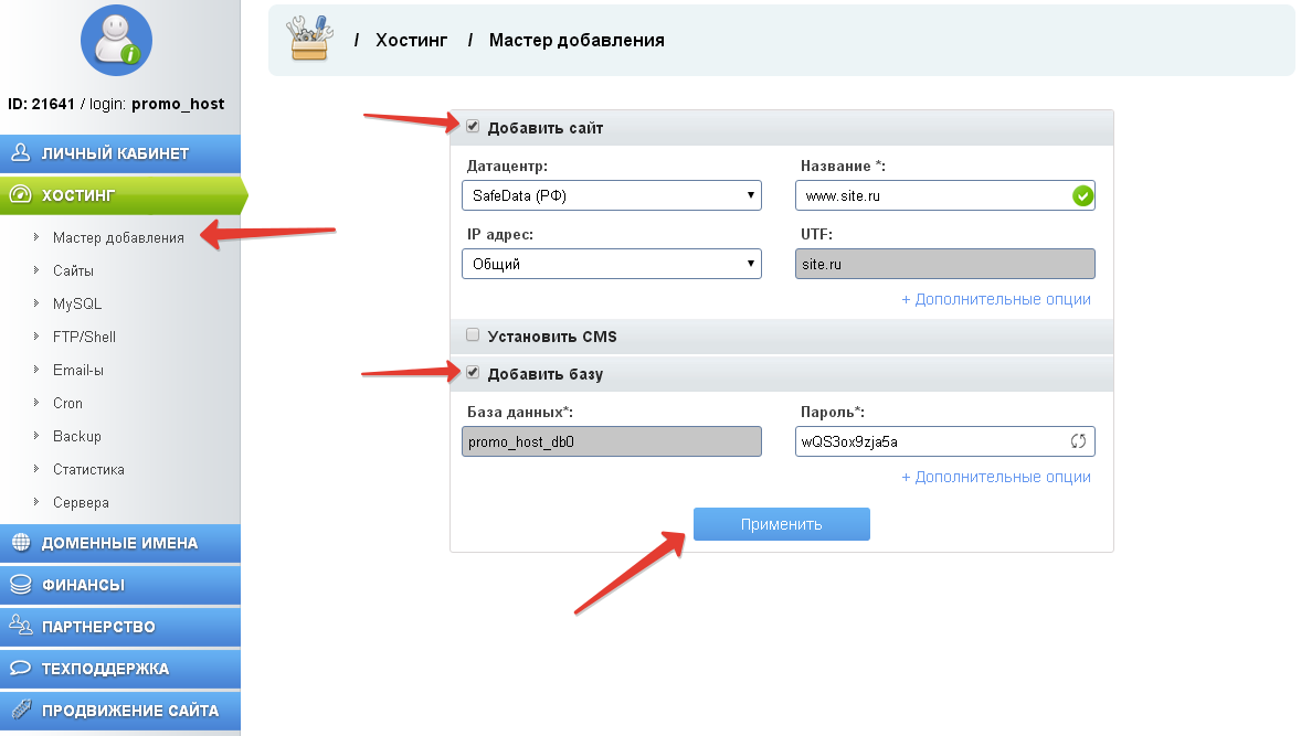 2. Добавьте сайт и при необходимости базу данных в панели управления в разделе Мастер добавления.
