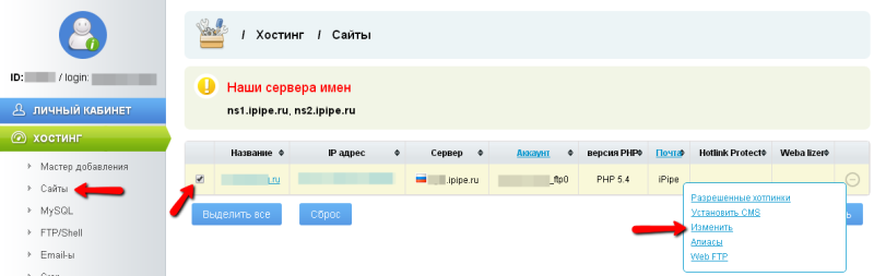 Для того, чтобы изменить версию PHP на нужную вам перейдите в раздел Хостинг -> Сайты — напротив сайта для которого нужно изменить версию PHP нажимаем на значок