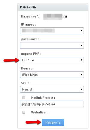 В новом окне в выпадающем списке версия PHP*: выбираем нужную версию PHP и завершаем это действие нажатием кнопки Изменить