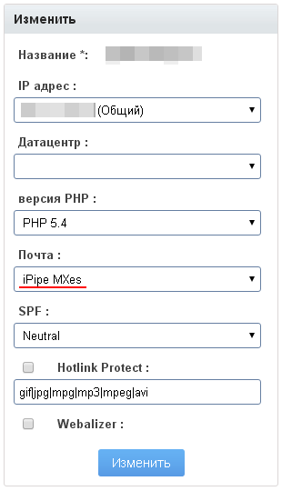В появившейся форме необходимо указать в поле «Почта» – «iPipe MXes». Нажмите кнопку Изменить.