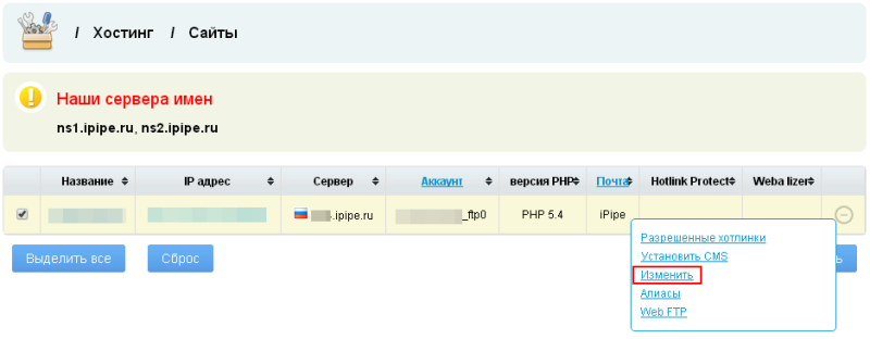 Далее, напротив интересующего Вас сайта в разделе Хостинг → Сайты, нажать на значок (+) и выбрать «Изменить».