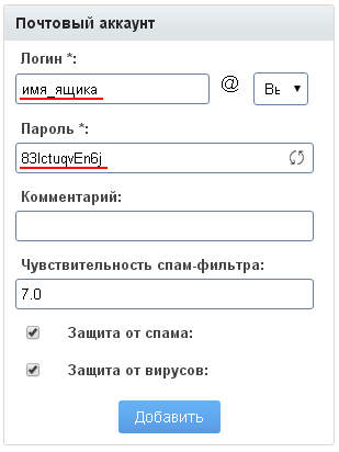 - Заходим в панель управления в раздел E-mail'ы — в секции «Почтовые аккаунты» заполняем необходимые поля. 1):