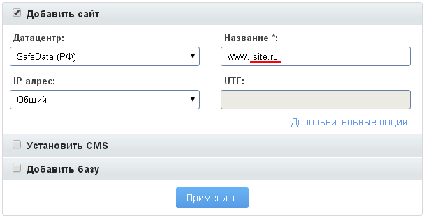 В панели управления хостингом, перейдите в раздел Хостинг -> Мастер добавления. Отметьте галочкой пункт Добавить сайт.