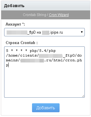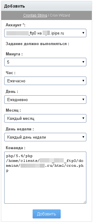 Для добавления задания можно указать непосредственно строку планировщика, роль которого на сервере выполняет программа cron, либо воспользоваться Мастером планировщика. При добавлении задания необходимо указать FTP-аккаунт, с правами которого будет выполняться команда. В текстовом поле Строка планировщика: нужно ввести строку cron.