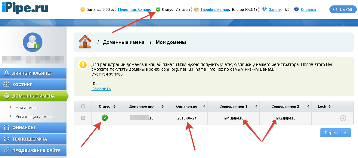 1. Первое, что необходимо сделать, это проверить активен ли Ваш аккаунт и домен в панели управления и дату окончания делегирования домена. Также проверьте, корректные ли сервера имен прописаны для домена.