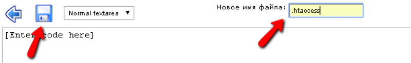 . Вы перейдете в текстовый редактор, в поле Новое имя файла – введите .htaccess и нажмите иконку сохранить