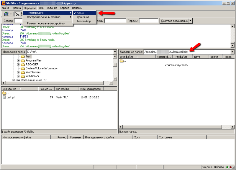 В верхнем меню, перейдите в Передача – Тип передачи, и убедитесь что установлен режим ASCII.