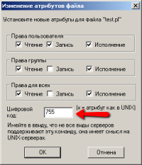 Большинство скриптов CGI требуют установки прав 755. Пожалуйста, обращайтесь к инструкции, прилагаемой к скрипту, для получения дополнительных указаний установки.